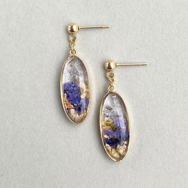 光を受けてきらめく“植物のしずく”。 大人の耳元をやさしく華やかに彩る、押し花と琉球ガラスを使ったレジンアクセサリー。 本物の押し花とゴールドフレーク、琉球ガラスのカケラを透明感のあるレジンに閉じ込めたイヤーアクセサリー。 ひとつひとつ手作業で丁寧に封入しており、 同じものがふたつとない特別な表情を楽しんでいただけます。 ゆらりと揺れる縦長シルエットは、顔まわりに自然な抜け感をつくり、上品ながらも華やかな印象に。 普段使いはもちろん、特別な日のお出かけ、ギフトにもぴったりです。 [サイズ] パーツ:24mm×10mm 全長:約38mm [金具] サージカルステンレス [注意点] ・一つ一つ丁寧に作成していますが、天然素材を使用しているため画像と全く同じ仕上がりではございません ・手作業のため気泡、押し花の欠け、透け、ムラ、小さい糸くずの混入等がある場合がございます。 ・天然素材のお花を使用しているため、大きさ、色、形など個体差がございます。 ・お花によっては作品に若干の色味の違いがでます。 ・時間の経過と共にお花のお色が退色していきます。 ・レジンは劣化すると変色したりします。保管する際は日の当たらない場所に保管することをオススメいたします。 ・レジン部分の厚みは個体差がございます。 ・写真と実物の色味や質感が多少異なって見えることがございます。 ・金具には小さな傷がついている場合があります。 [発送について] ご購入後、制作し発送となります。 なるべく早く発送できるよう努めますが、購入後14日を目安に発送させていただきます。 余裕を持ってご注文ください。 [アフターケアについて] 作品到着後初期不良や故障等ございましたら、14日以内にご連絡下さい。 14日以上経過されますと対応いたしかねますのでご了承下さい。
