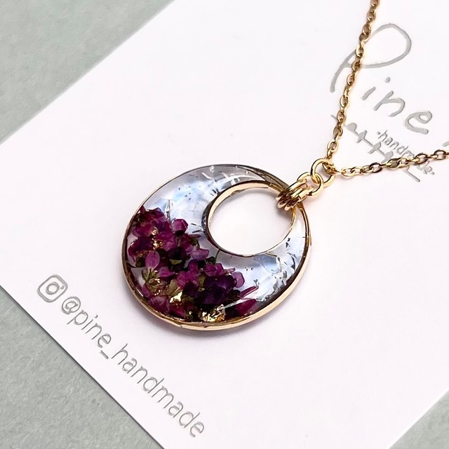 透明感のあるレジンに、押し花と琉球ガラスカレットを丁寧に封じ込めたハンドメイドネックレス。 鮮やかなパープルの小花と、爽やかな琉球ガラスのカケラが、まるで小さな庭園のような印象を与えてくれます。 金箔のきらめきがアクセントとなり、上品さと華やかさをプラス。 パーツサイズ:19mm チェーン長さ:40cm(アジャスター+5cm) 金具:サージカルステンレス 素材:レジン.琉球ガラス.押し花 [注意点] ・一つ一つ丁寧に作成していますが、天然素材を使用しているため画像と全く同じ仕上がりではございません ・手作業のため気泡、押し花の欠け、透け、ムラ、小さい糸くずの混入等がある場合がございます。 ・天然素材のお花を使用しているため、大きさ、色、形など個体差がございます。 ・お花によっては作品に若干の色味の違いがでます。 ・時間の経過と共にお花のお色が退色していきます。 ・レジンは劣化すると変色したりします。保管する際は日の当たらない場所に保管することをオススメいたします。 ・レジン部分の厚みは個体差がございます。 ・写真と実物の色味や質感が多少異なって見えることがございます。 ・金具には小さな傷がついている場合があります。