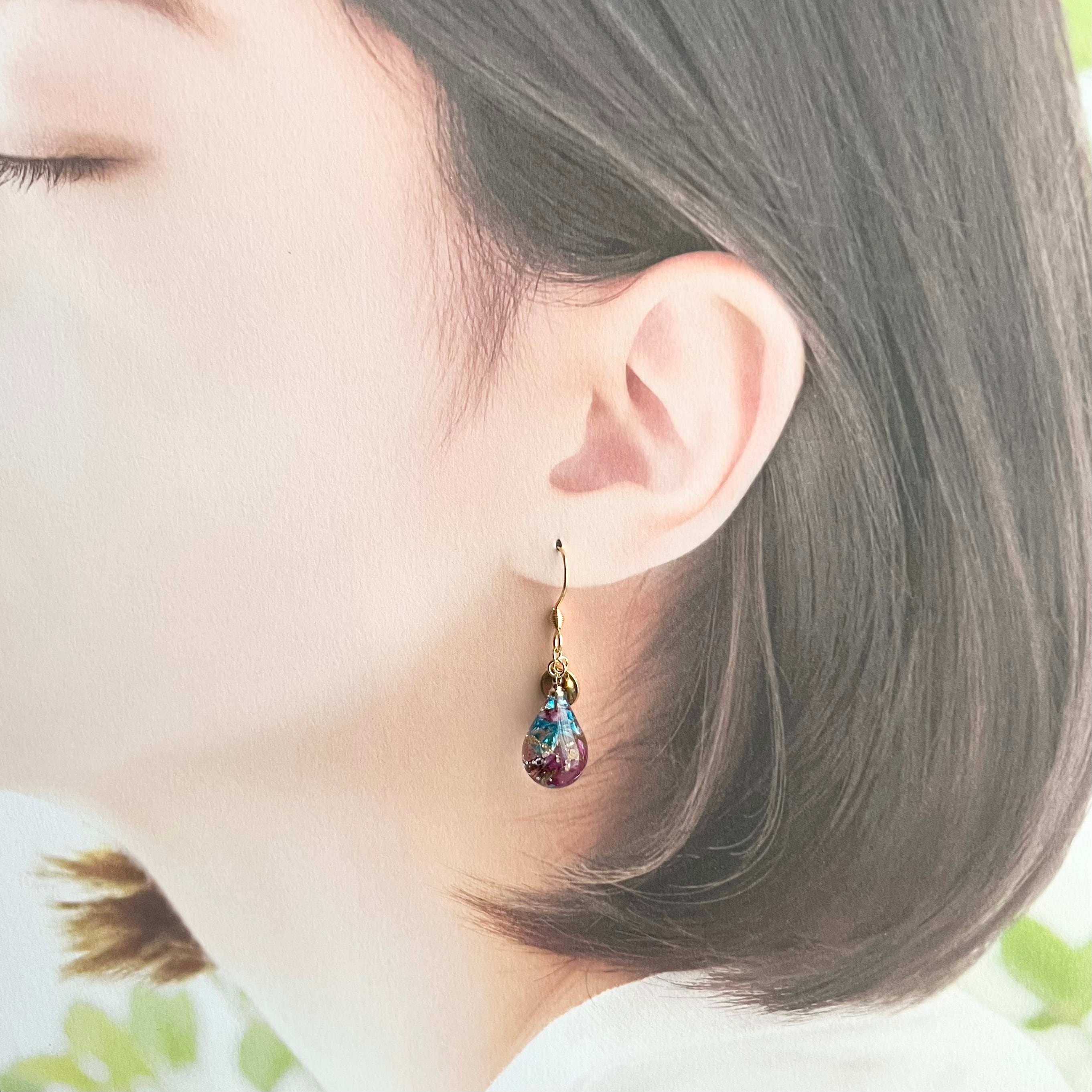 【空のしずく】ピアス/琉球ガラス/押し花/アレルギー対応/沖縄/リゾートアクセサリー