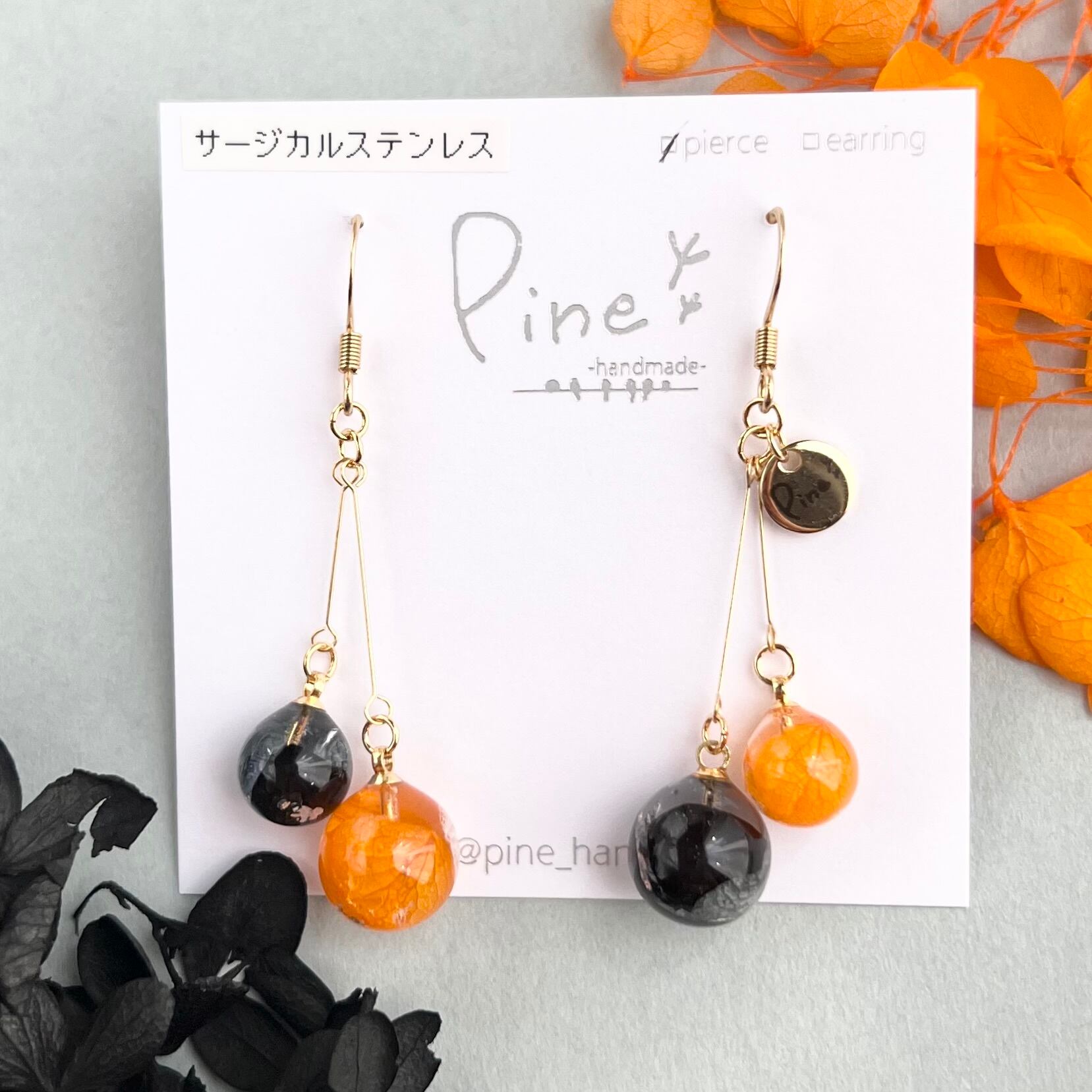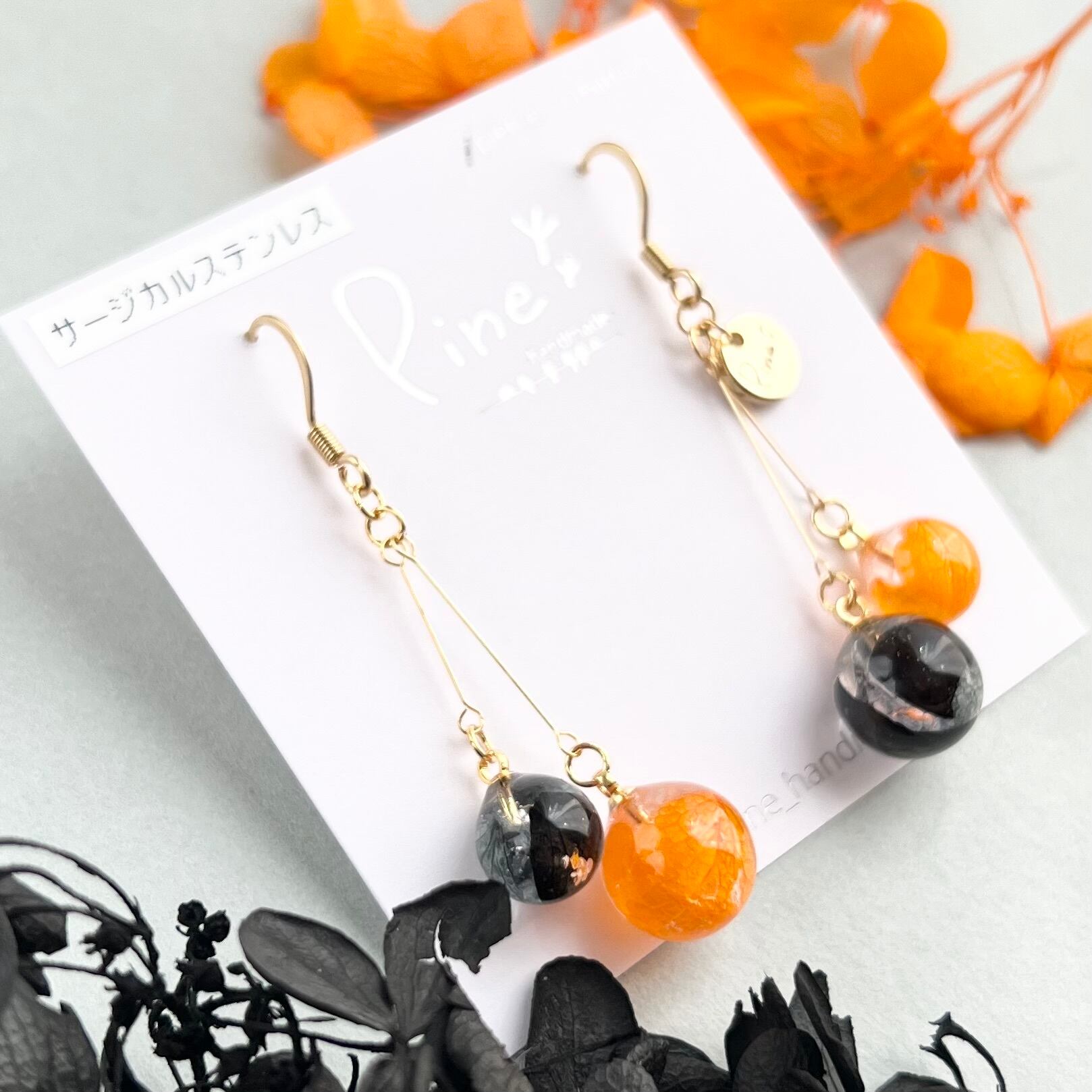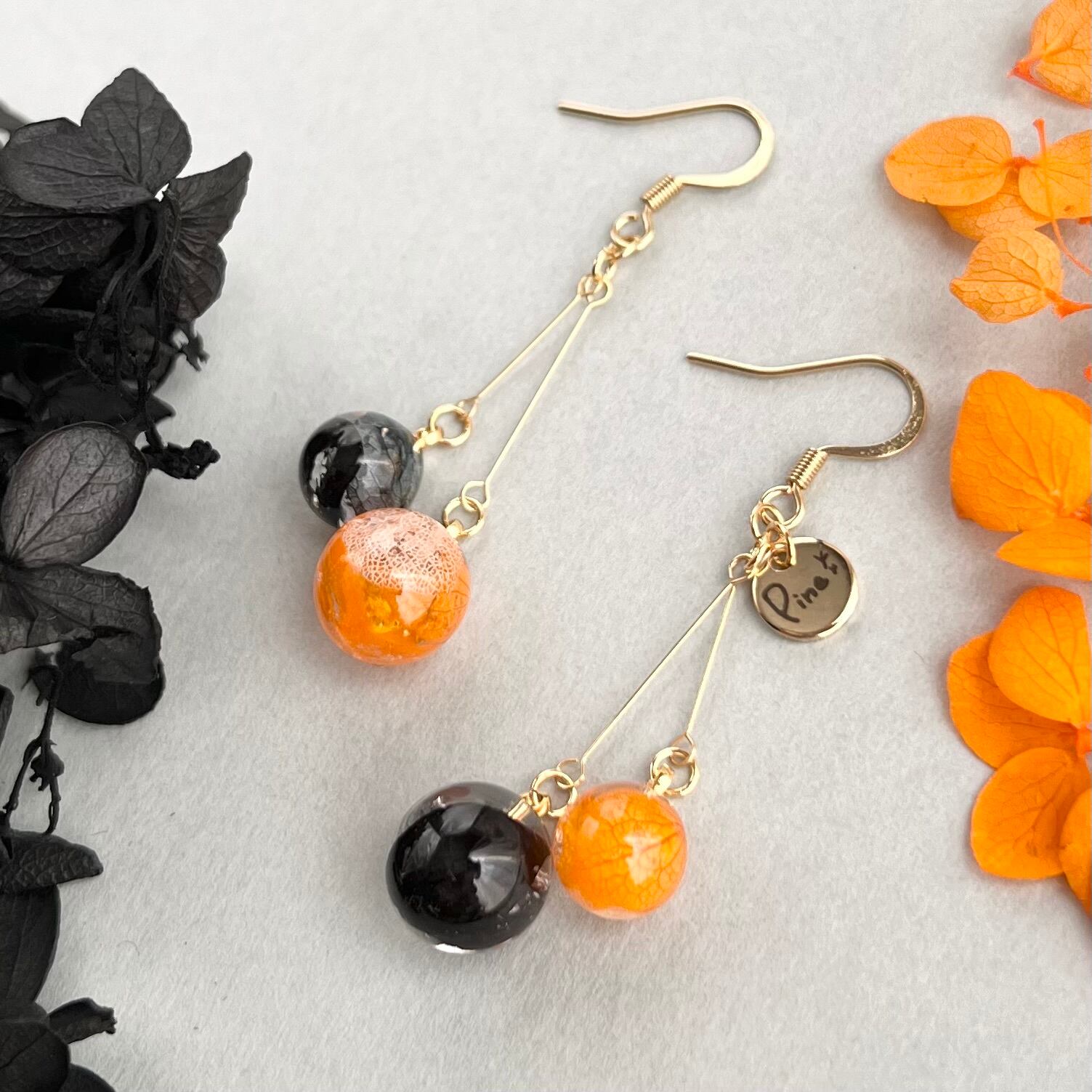 オレンジとブラックのコントラストが印象的な、ハロウィンカラーの2連のピアス。