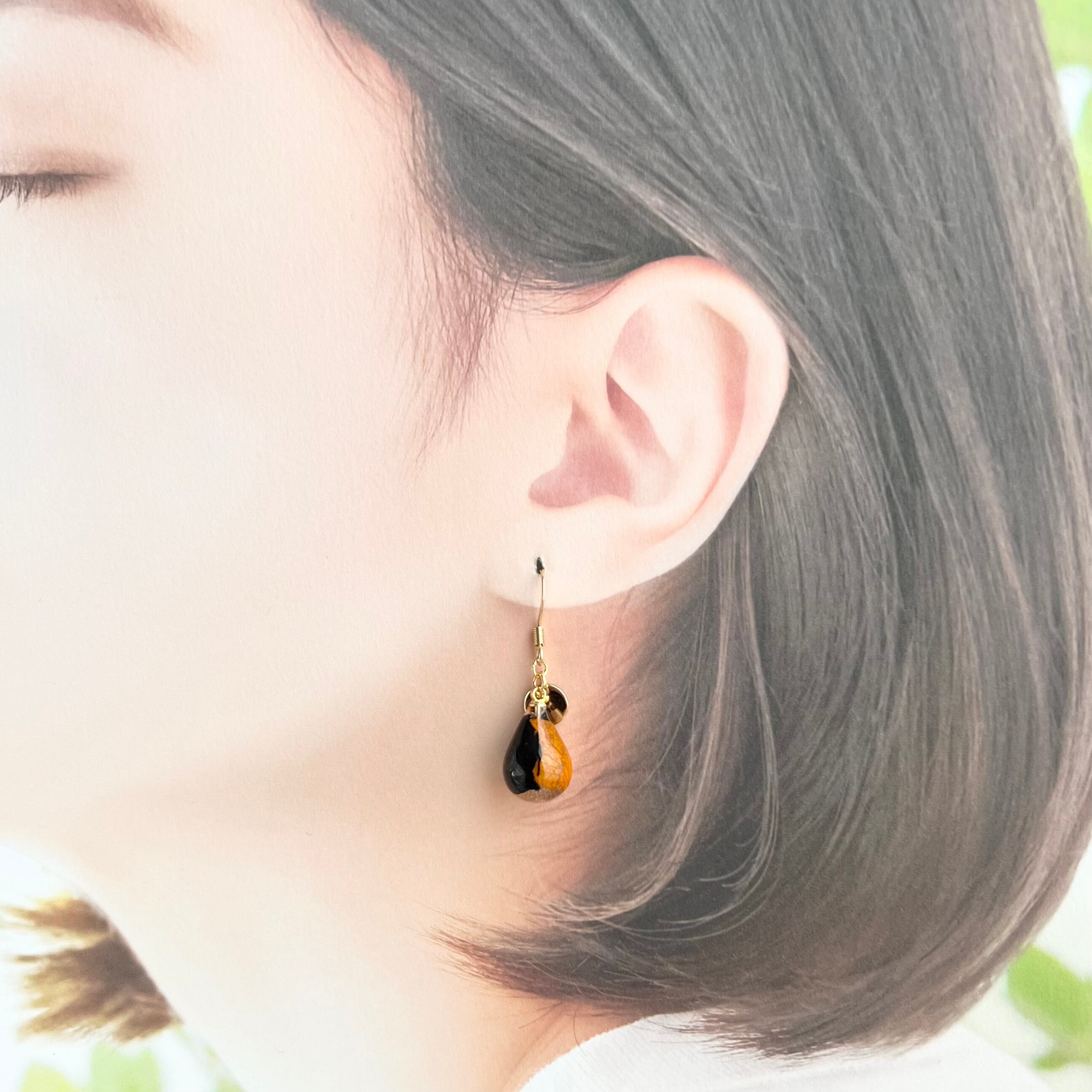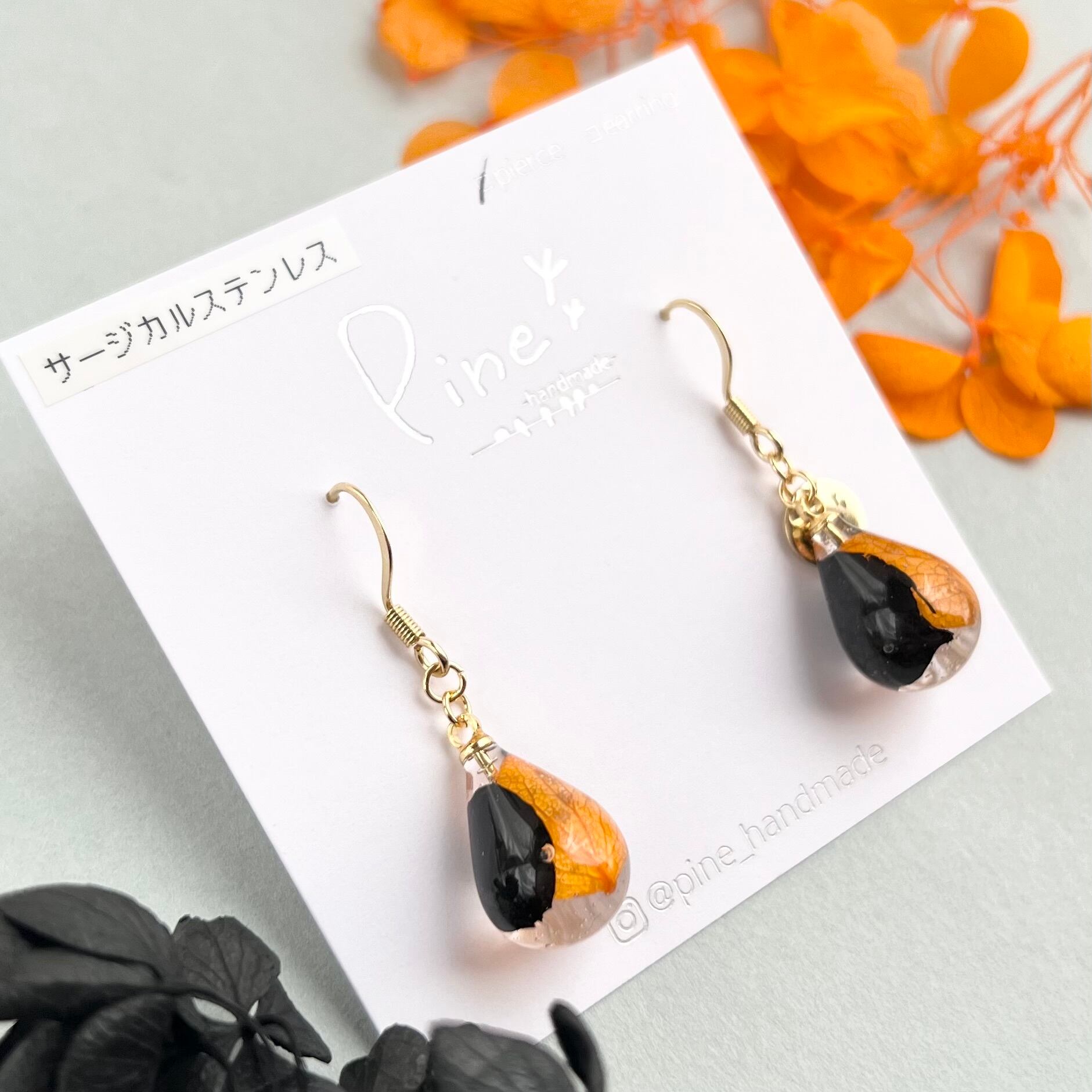 オレンジとブラックのコントラストが印象的な、ハロウィンカラーの雫のピアス。