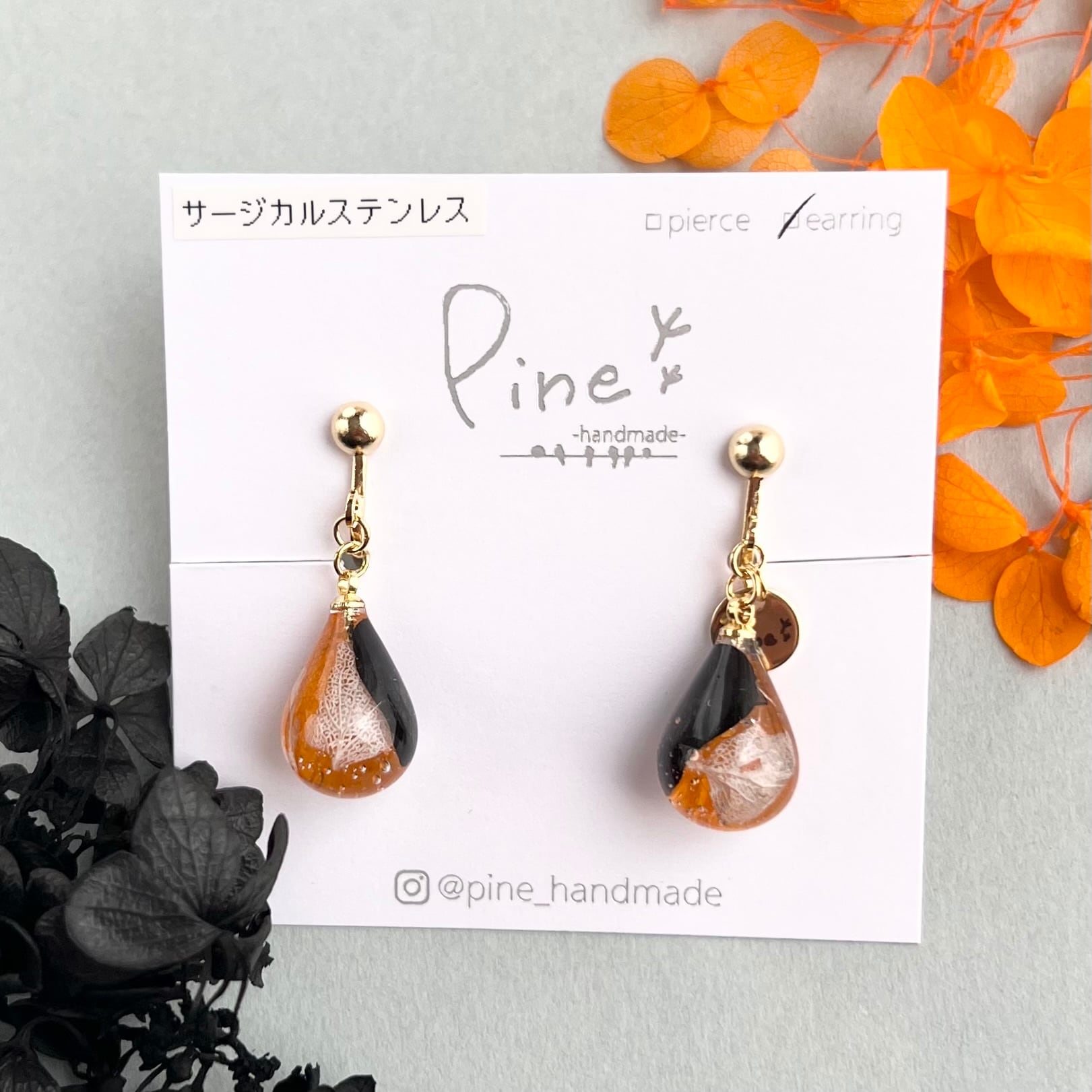 オレンジとブラックのコントラストが印象的な、ハロウィンカラーの雫のピアス。