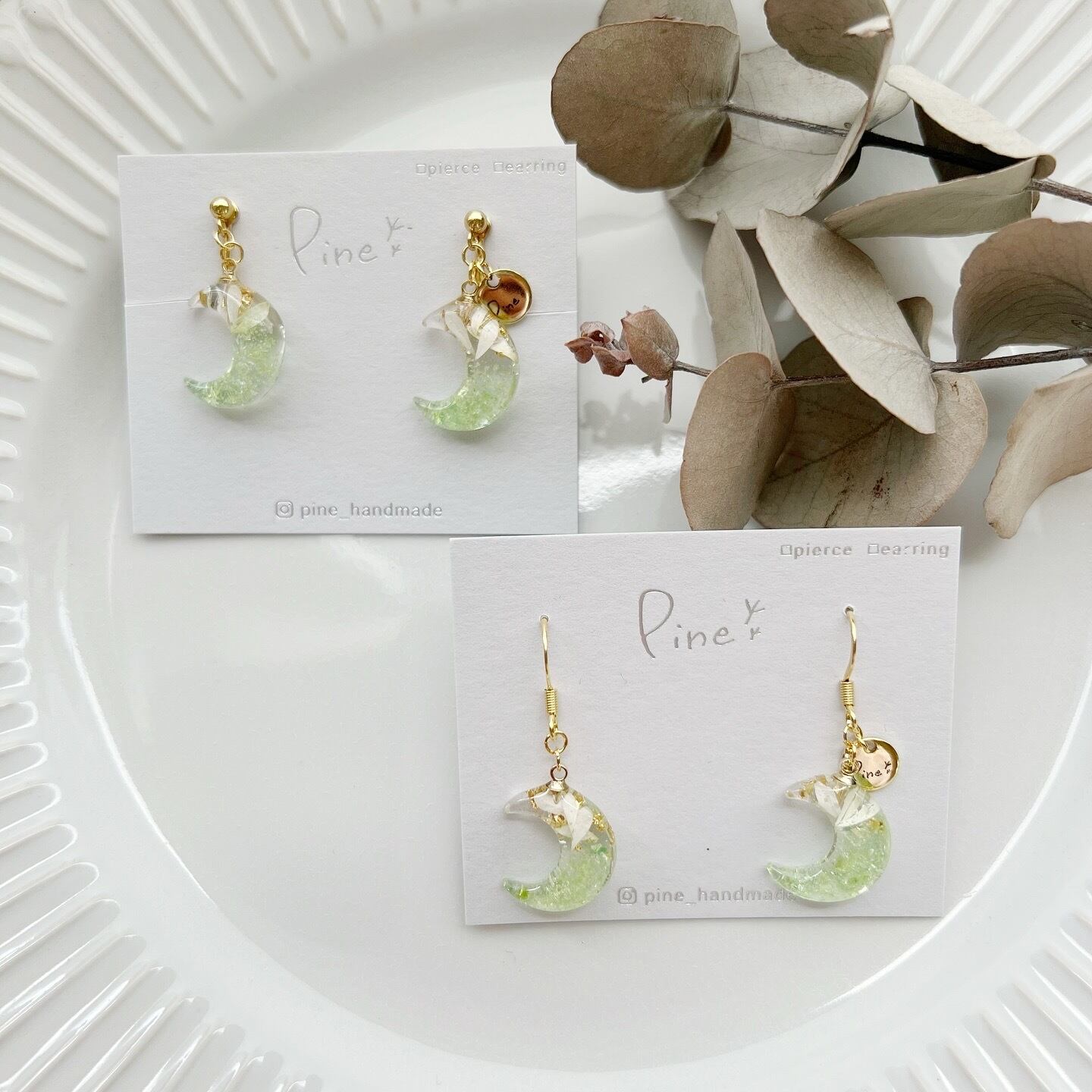 三日月〜crescent moon〜 /グリーン/イヤリング/琉球ガラス/押し花/沖縄アクセサリー